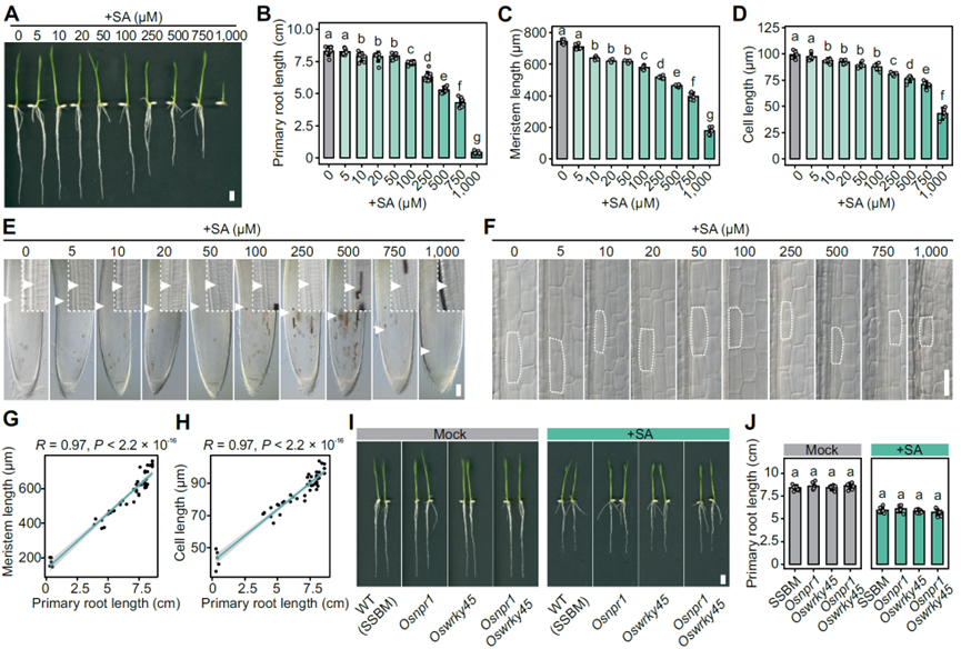 图1. 外源水杨酸通过不依赖OsNPR1/OsWRKY45的途径调控水稻根系生长