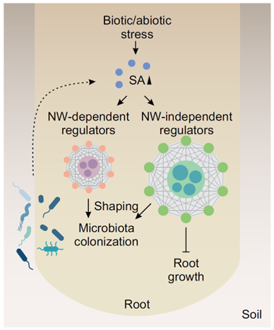 图3. 水杨酸介导的植物根系生长和微生物定植调控网络的工作模型