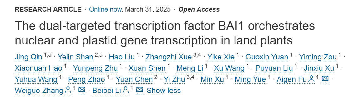 近日,十大外围足球平台app付爱根/李贝贝/张卫国团队在Molecular Plant(5-year IF:21.4)发表了题为“The dual-targeted transcription factor BAI1 orchestrates nuclear and plastid gene transcription in land plants”的研究论文。该研究揭示了一种在陆地植物中保守的分子调控机制:细胞核-质体双靶向转录因子BAI1,能够同时精确调控细胞核和质体基因组的转录过程。