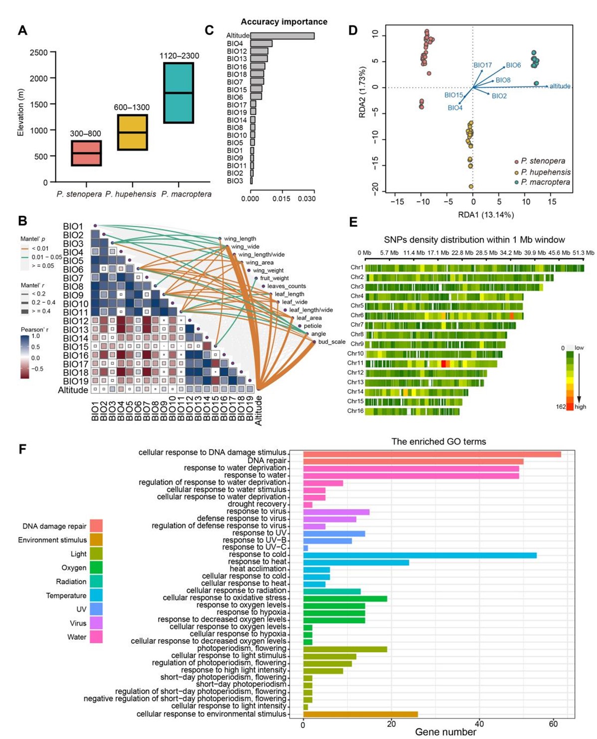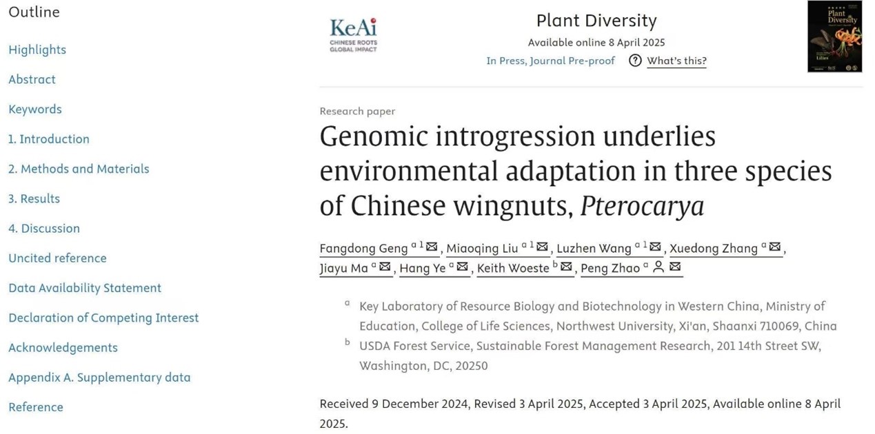 近日,十大外围足球平台app赵鹏教授团队在植物科学领域期刊Plant Diversity (中科院一区Top)在线发表了题为“Genomic introgression underlies environmental adaptation in three species of Chinese wingnuts, Pterocarya”的研究论文,探究了第三纪孑遗木本植物枫杨及其近缘种在秦巴山区的环境适应性,揭示了基因渐渗在不同海拔分布物种环境适应性中的重要作用以及杂交渐渗在基因组上的特征足迹。