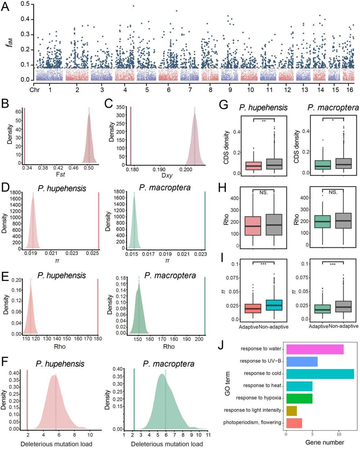 分布在高海拔物种的近交系数最低,而分布在中间海拔物种的杂合度最高。中间海拔物种保留的渐渗区域具有较低的遗传突变负荷和较高的遗传多样性,且位于遗传分化较低但重组率较高的区域(图3)。团队还确定了P. hupehensis和P. macroptera之间发生基因渗入的区域,并在这些渗入区域内发现了与环境适应相关的候选基因(TPLC2、CYCH、LUH、bHLH112、GLX1、TLP-3和ABC1)。