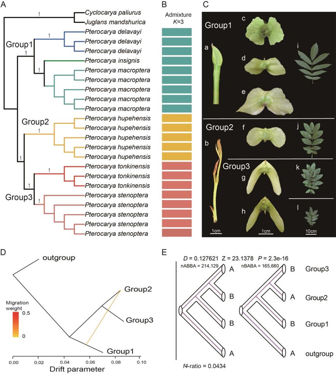 项目团队通过研究构建系统发育树的结果发现,中国分布的六个枫杨属物种可被分为与表型对应的三个组。组1具芽鳞(芽鳞包裹嫩芽,具有保温作用),分布海拔较高,组3裸芽,分布海拔最低,组2也为裸芽,但分布海拔位于组1和组3之间,组1对组2有一个显著的基因渐渗(图1)。