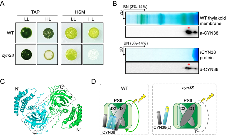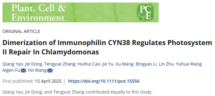 植物和藻类等光合生物通过光合作用将光能转化为化学能,是生物质能源生产的生物学基础。强光胁迫产生的活性氧分子对光合系统造成损伤,大大降低光合效率。光系统II(PSII)位于光合电子传递链的首要位置,其在强光下的有效修复决定了光合作用的稳定运行。十大外围足球平台app付爱根教授领衔的植物分子生物学团队长期围绕光合生物的强光逆境响应机制开展深入研究,并取得一系列重要进展,发掘出多种参与光系统II组装修复的调节因子(Fu et al., 2007; Fu et al., 2023; Guo et al., 2024; Dong et al., 2024)。近日,该团队在中科院一区TOP期刊Plant, Cell & Environment在线发表了一篇题为“Dimerization of immunophilin CYN38 regulates Photosystem II repair in Chlamydomonas”的研究论文,报道了莱茵衣藻亲免蛋白CYN38通过二聚化调节光系统II修复的分子机制。