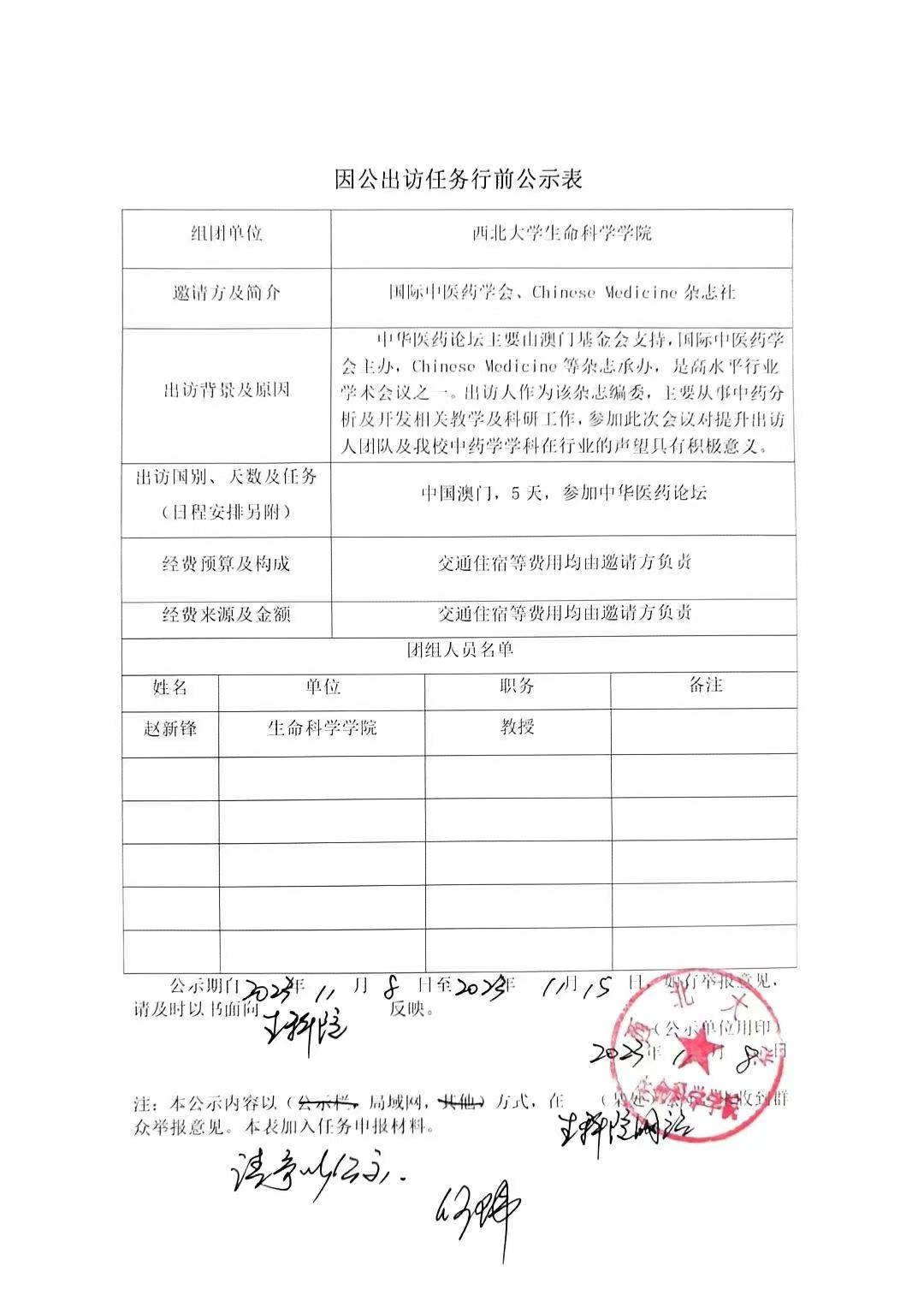 因公出访任务行前公示表